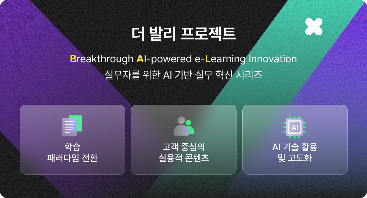 결국 핵심은 제반의 이유로 임직원에게 실질적인 변화를 만들어내기 어렵다는 건데요. 발리 프로젝트는 'Breakthrough AI-powered e-Learning Innovation'의 약자로, AI가 모든 업무 방식을 바꾸고 있는 거대한 변화의 흐름 속에서 '지금의 일하는 방식으로는 더 이상 성장할 수 없다'는 실무자를 위한 AI 기반 실무 혁신 시리즈입니다.